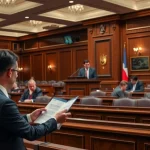 Ambiente político y contexto social vinculado a: ¿Por qué, a pesar de múltiples intentos, la Sala Plena no logra ponerse de acuerdo para votar sobre las presuntas violaciones al tope de gastos?. Iluminación cinematográfica, ambiente serio y profesional.